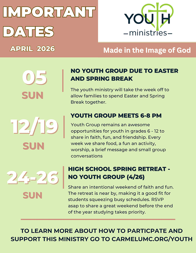 If you would like to volunteer your time, or help the youth ministry in any way, please reach out to Rick at rbelbutoski@carmelumc.org